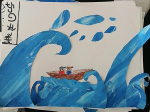 Enfin, les élèves ont pu prolonger ce travail en art : illustration des haikus (travail sur le camaïeu de bleu) et travail sur les idéogrammes.